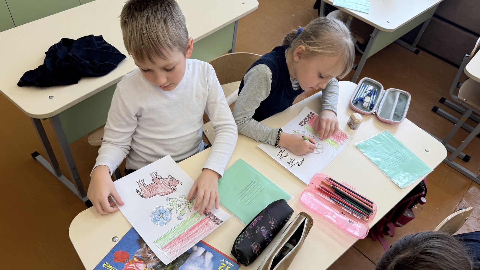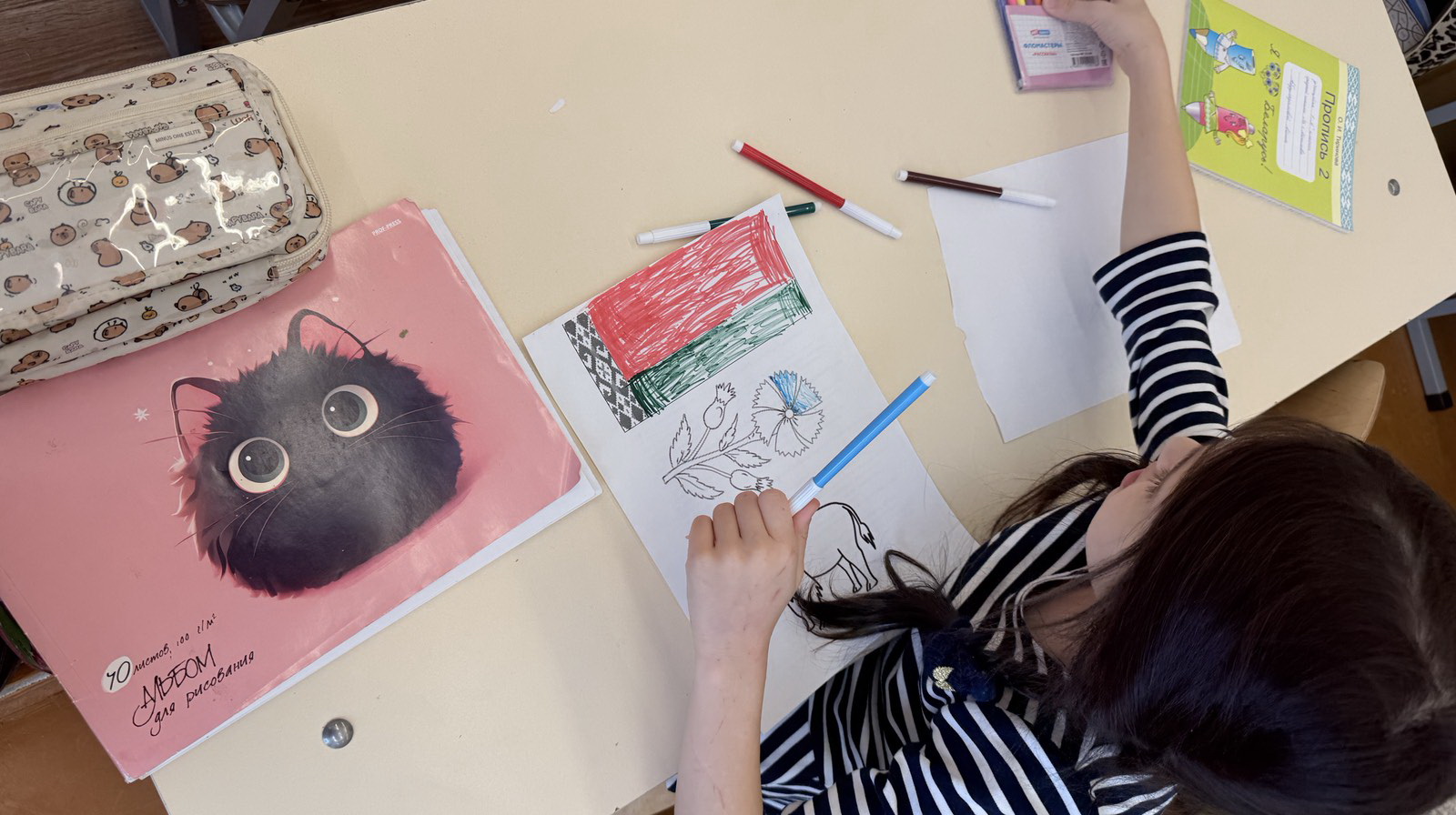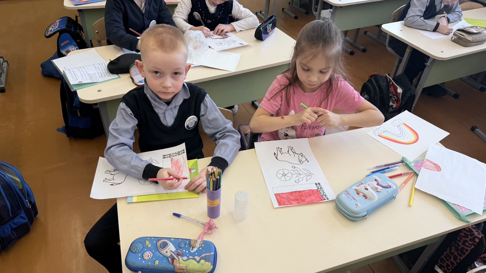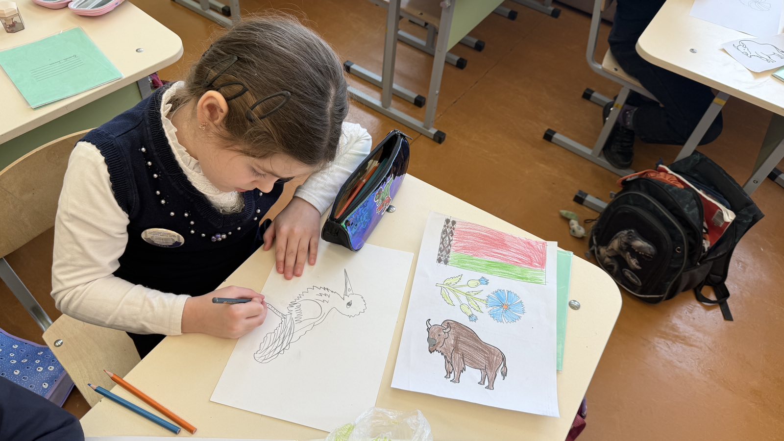 Финальным этапом стало творческое задание — рефлексивное рисование. Каждый ученик создал рисунок, отражающий его собственное восприятие символов Беларуси. Работы получились яркими, искренними и наполненными детским видением Родины.