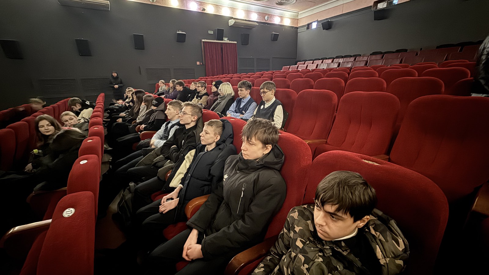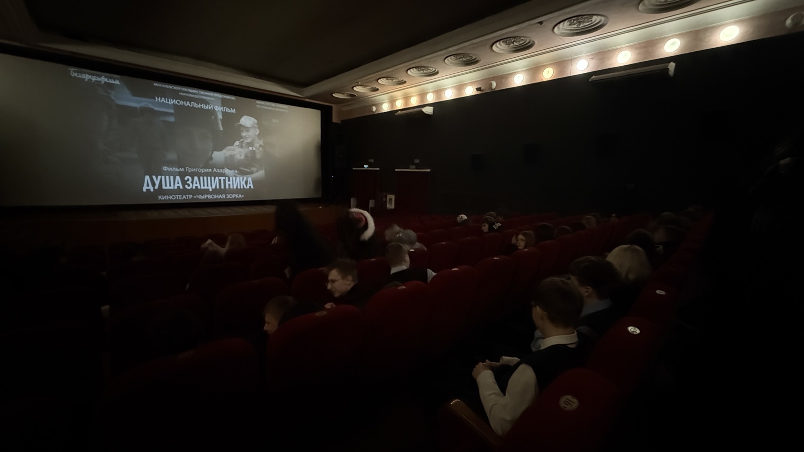 13.02.2026 учащиеся 8 «А» и 8 «Д» классов совершили совместный выход в кинотеатр на просмотр новой документальной ленты Григория Азаренка «Душа защитника».