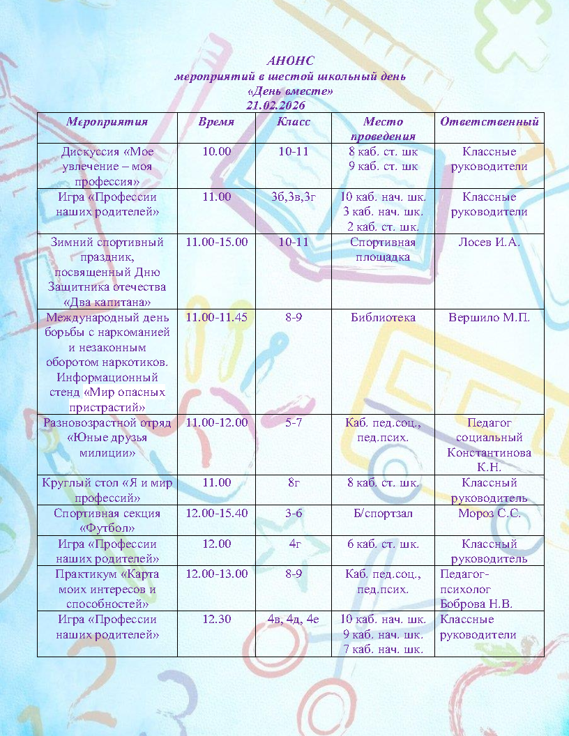 АНОНС МЕРОПРИЯТИЙ ШЕСТОГО ШКОЛЬНОГО ДНЯ 21.02.2026
