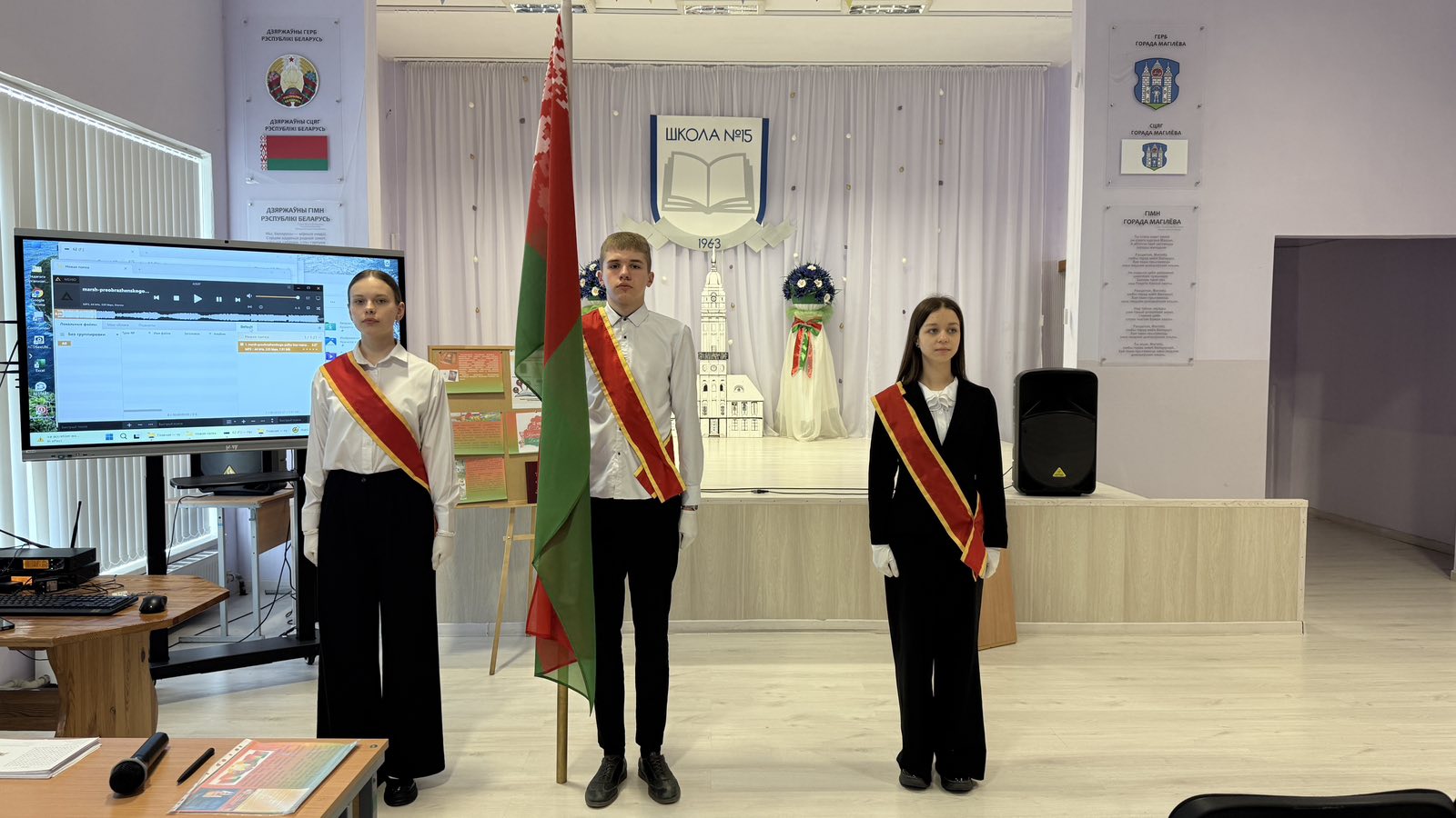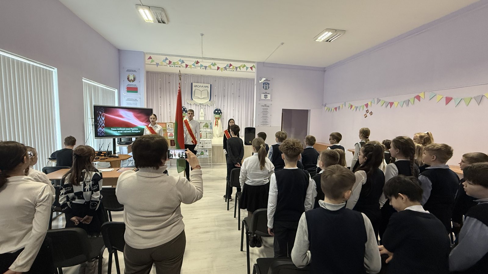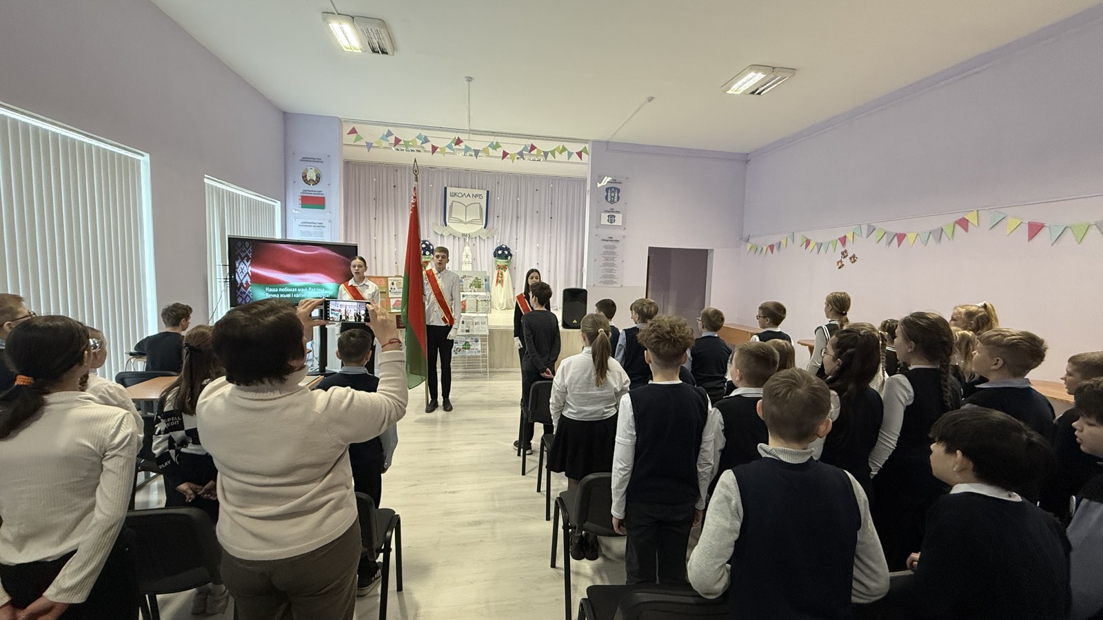 Торжественность моменту задала знаменная группа: под гордый вынос Государственного флага и мощные звуки Гимна Республики Беларусь, который мы исполнили все вместе, стартовал наш тематический марафон. 🎶🙌