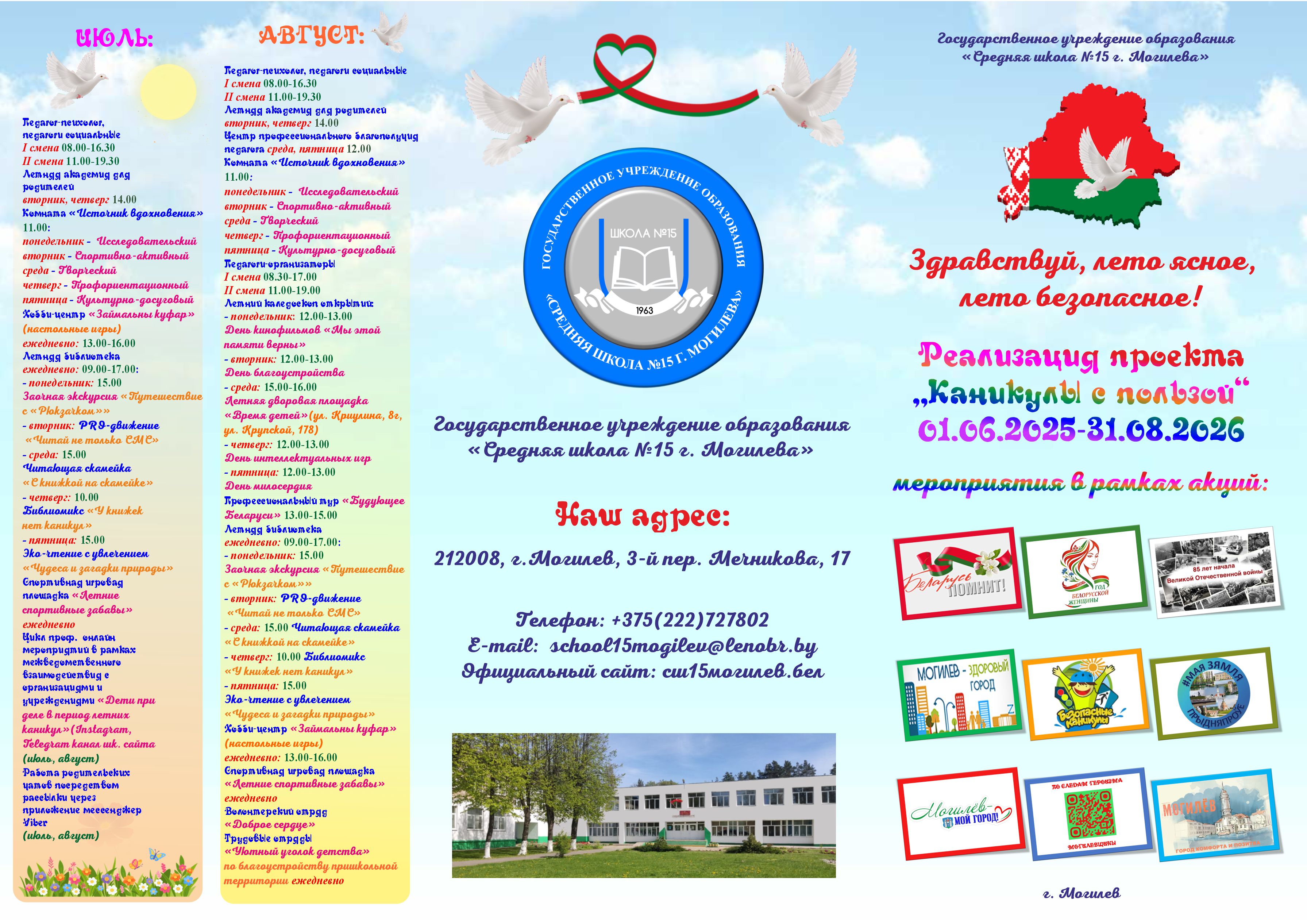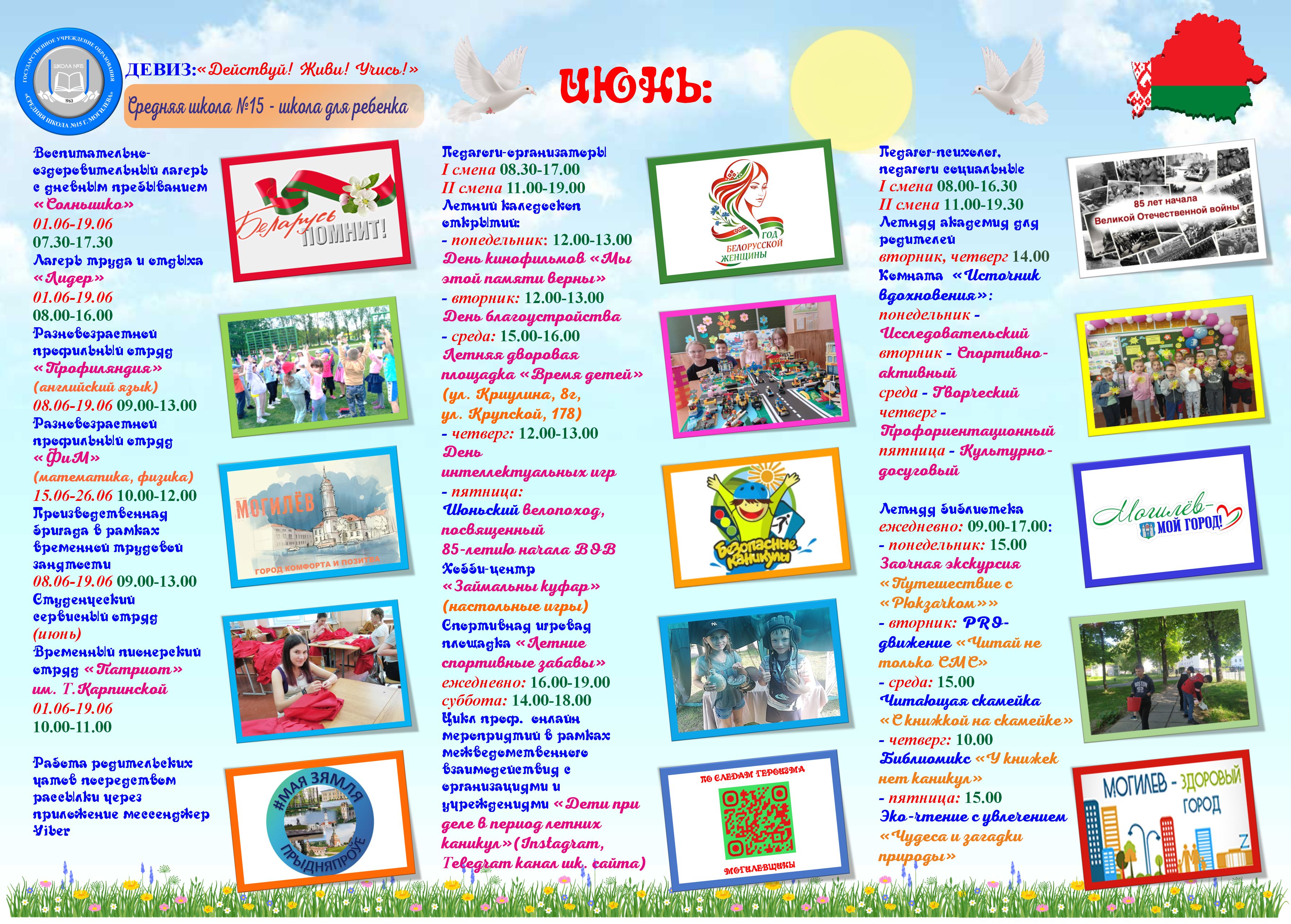 - Цель: совершенствования организации содержательного отдыха, оздоровления и занятости детей и подростков государственнного учреждения образования «Средняя школа № 15 г. Могилева» для оптимального удовлетворения потребности детей и их родителей в качественных и социально значимых услугах оздоровления и отдыха в период летних каникул 2026 года.